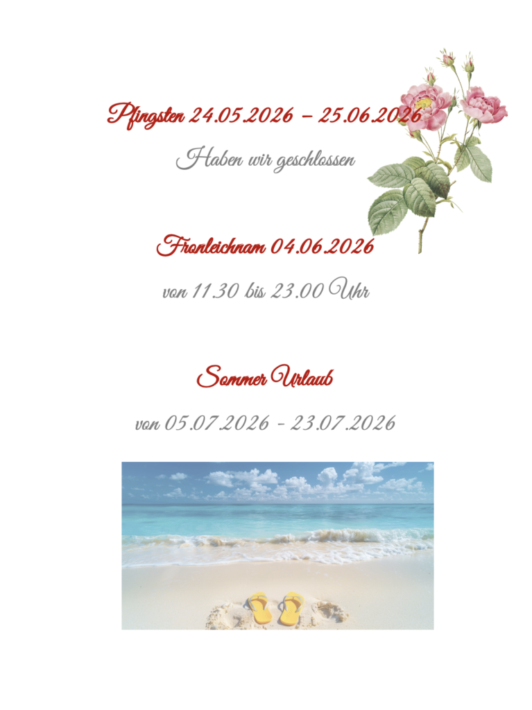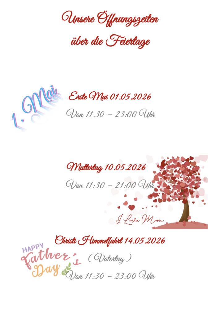 Wir organisieren Hochzeiten, Weihnachtsfeiern, Firmenfeiern, Taufen, Kommunionen, Konfirmationen, Geburtstage, Candlelight Dinner, Familienfeiern und Business bis zu 120 Personen in unserem kompletten Lokal oder im separatem Kolleg für etwa 45 Personen.